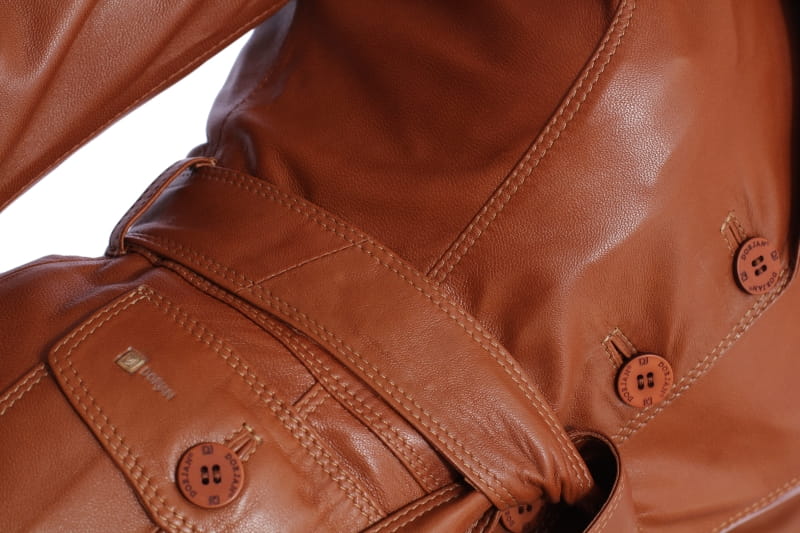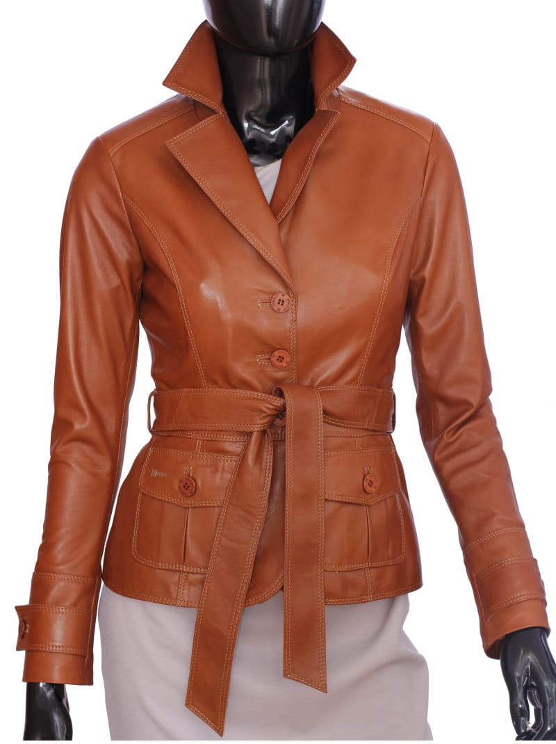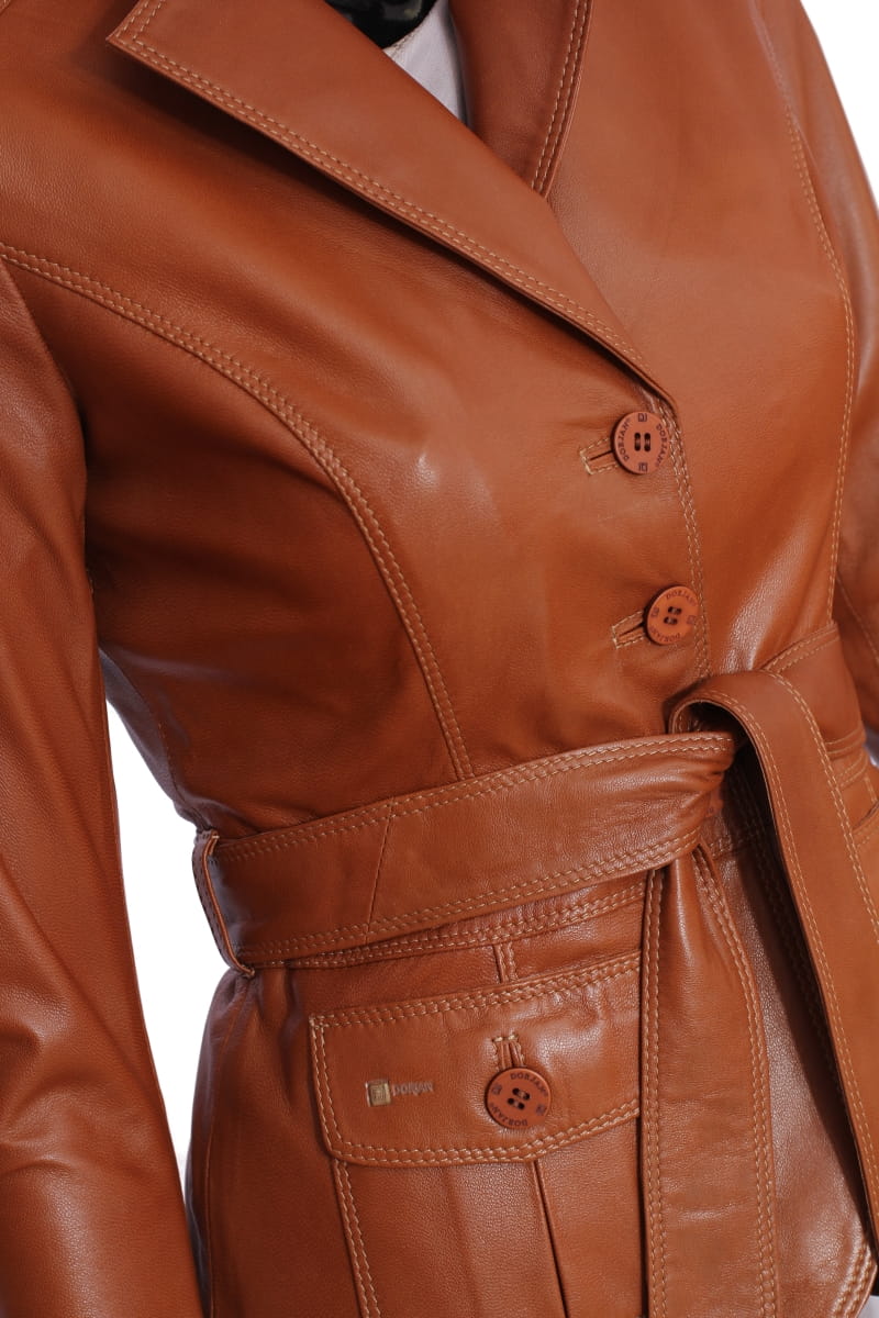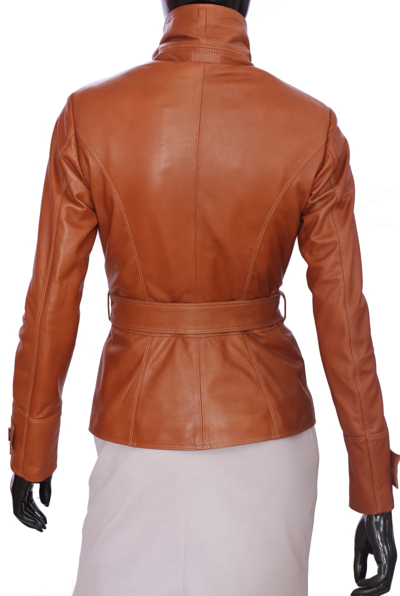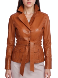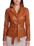 Camelowa marynarka skórzana damska z paskiem - rozmiar XL - Wyprzedaż DORJAN