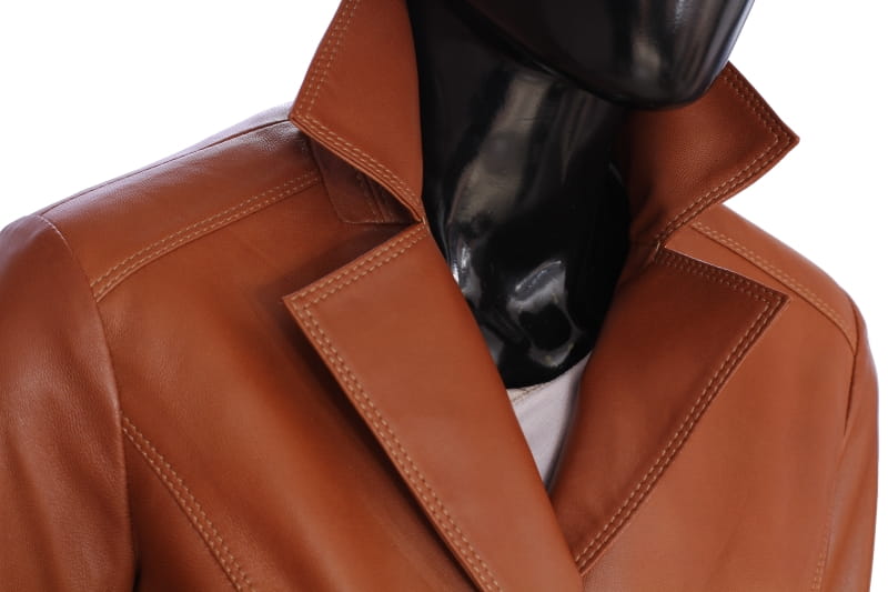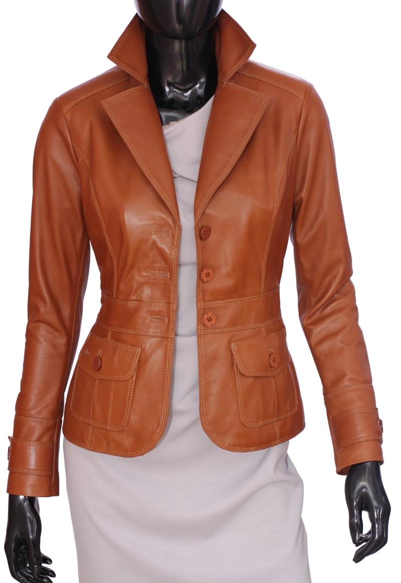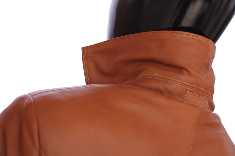 Na wyprzedaż trafia gotowy rozmiar XL modelu MNA085 firmy DORJAN. To klasyczna camelowa marynarka skórzana damska, zapinana na guziki, z naturalnej skóry owczej.