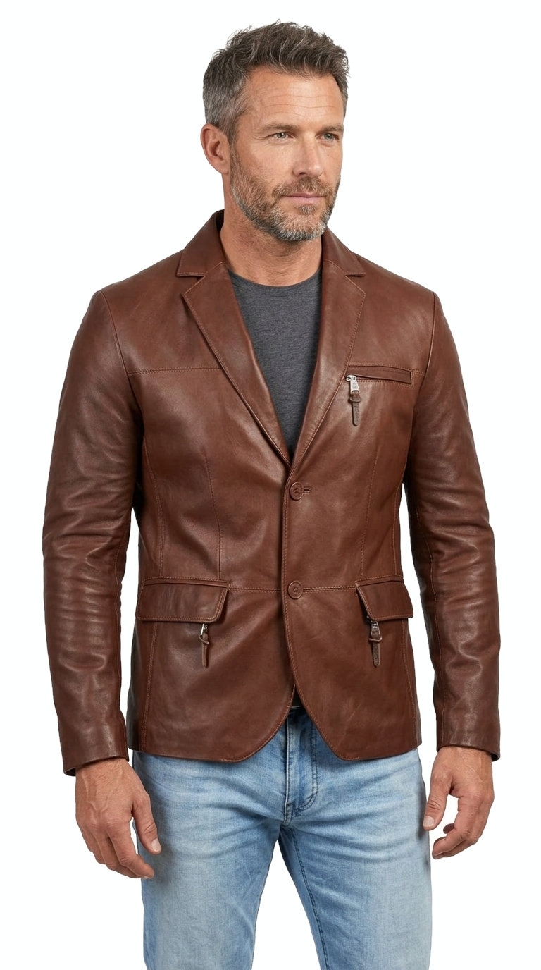 Casualowa marynarka skórzana męska brązowa - rozmiar S - Wyprzedaż DORJAN