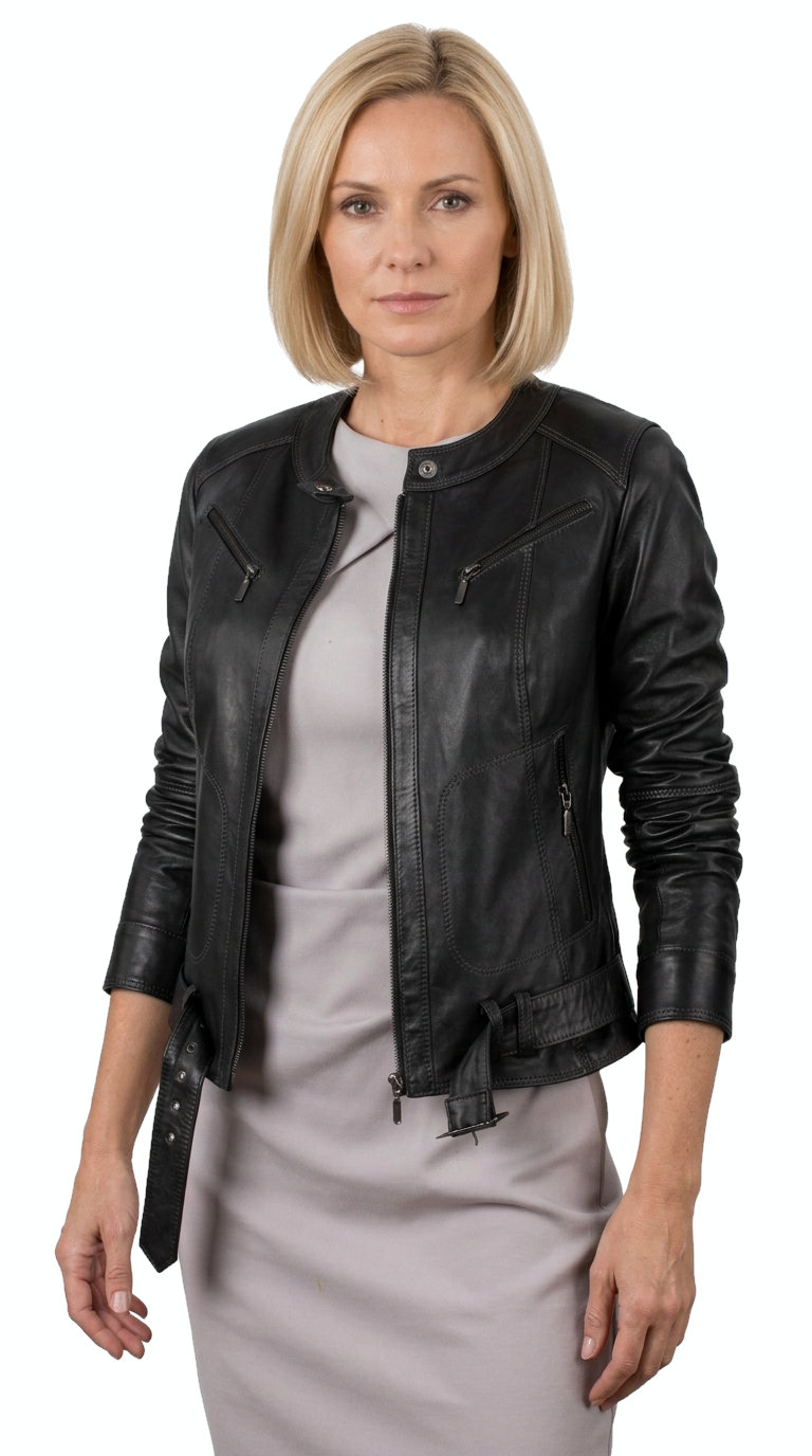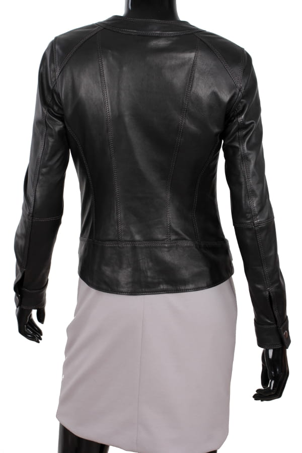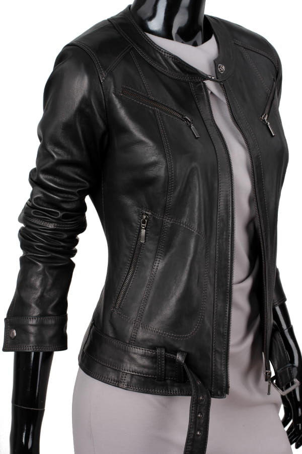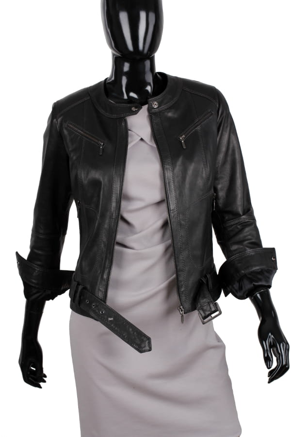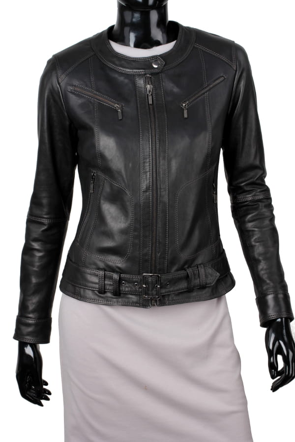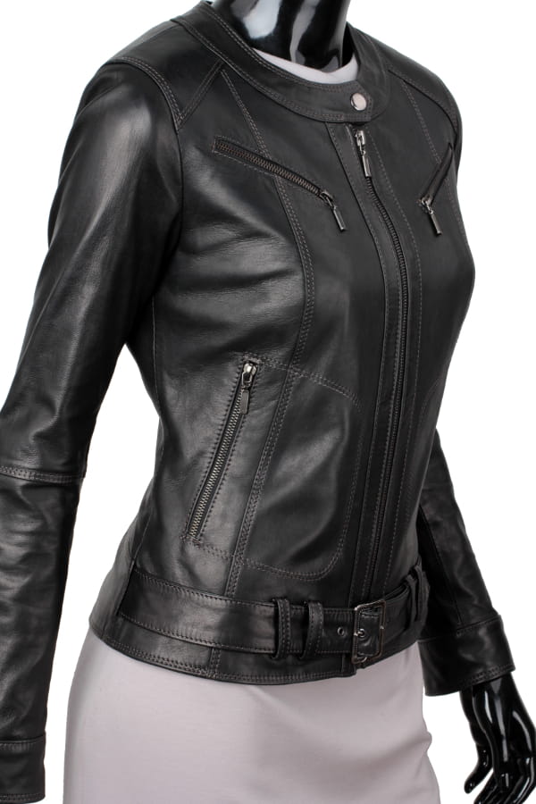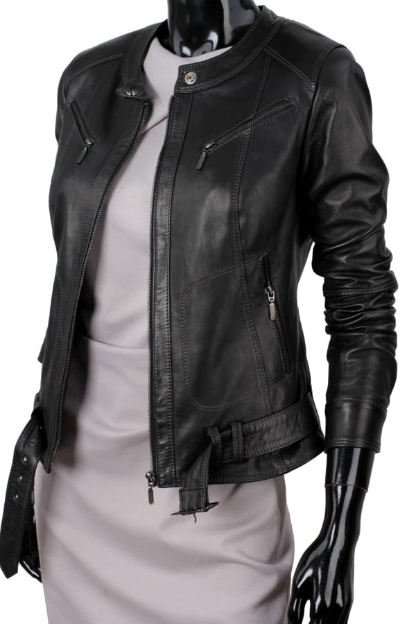 Na wyprzedaż trafia gotowy rozmiar XS z modelu SAR450_1 firmy DORJAN. To rockowa kurtka skórzana damska, uszyta z naturalnej skóry owczej w klasycznym czarnym kolorze.