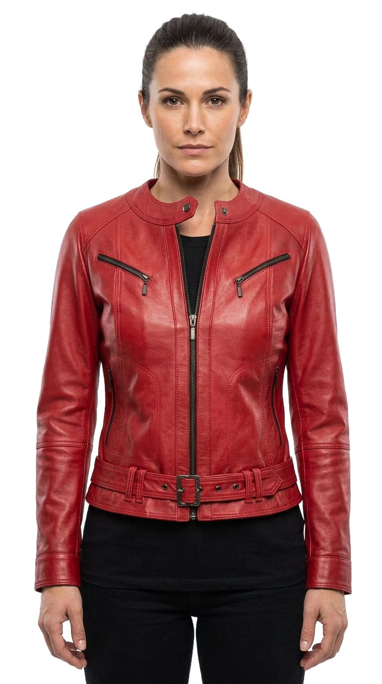 Czerwona damska kurtka skórzana z paskiem na klamrę - rozmiar XL - Wyprzedaż DORJAN