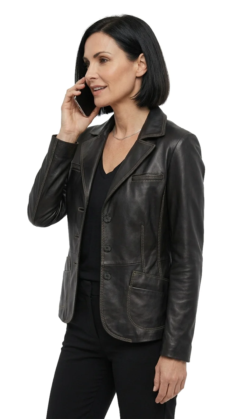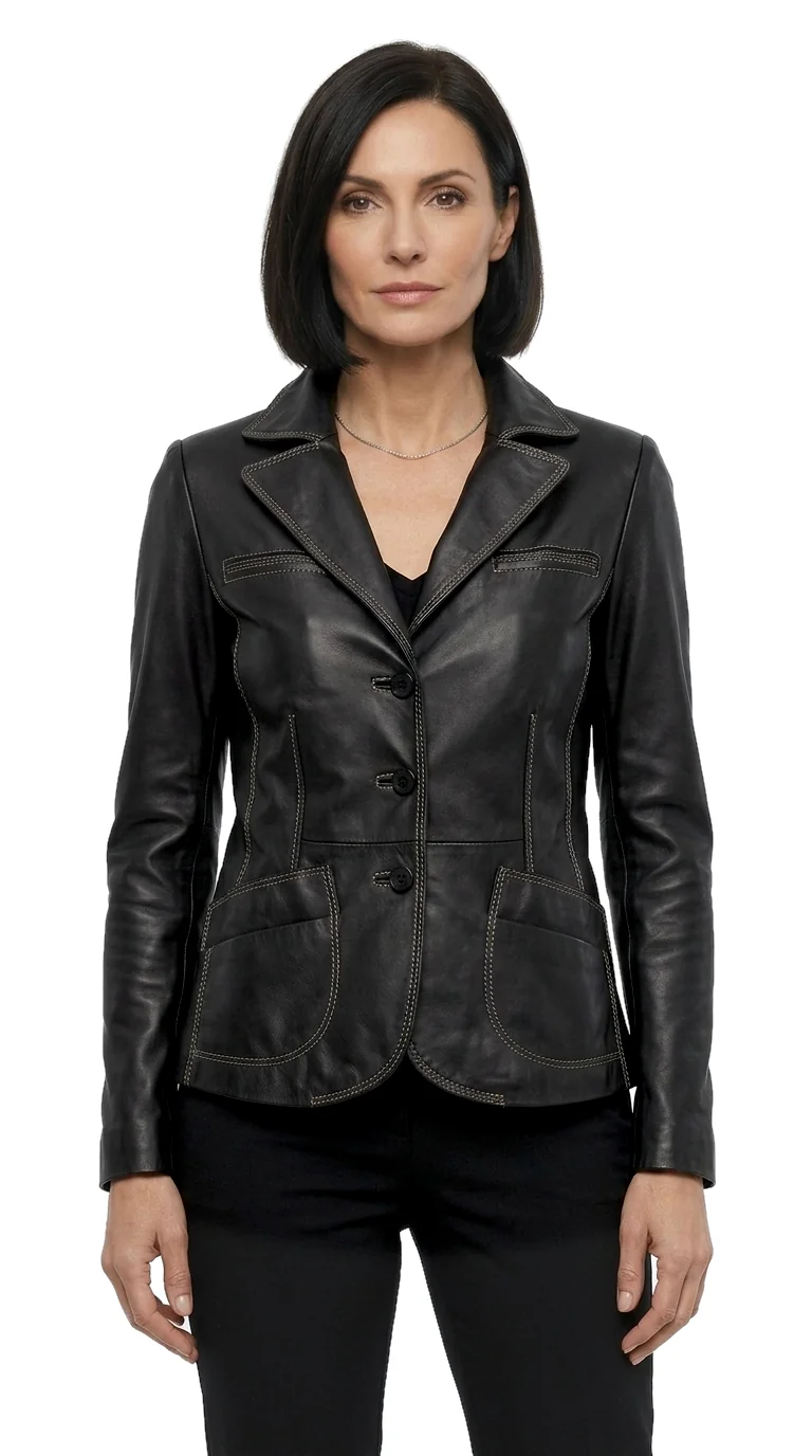 Model ADA450_1ML firmy DORJAN to casualowa marynarka skórzana damska, zapinana na guziki ustawione w jednym rzędzie. Całość uszyta z naturalnej skóry owczej licowej w klasycznej czerni. Głównym elementem ozdobnym tej marynarki, są podwójne stebnowania kontrastową nicią, które podkreślają linie kroju. Delikatne taliowanie pomaga podkreślić kobiecą figurę. Model ten może być noszony zarówno jako marynarka w bardziej swobodnych kreacjach lub jako codzienne okrycie wierzchnie w casualowych, codziennych zestawieniach.