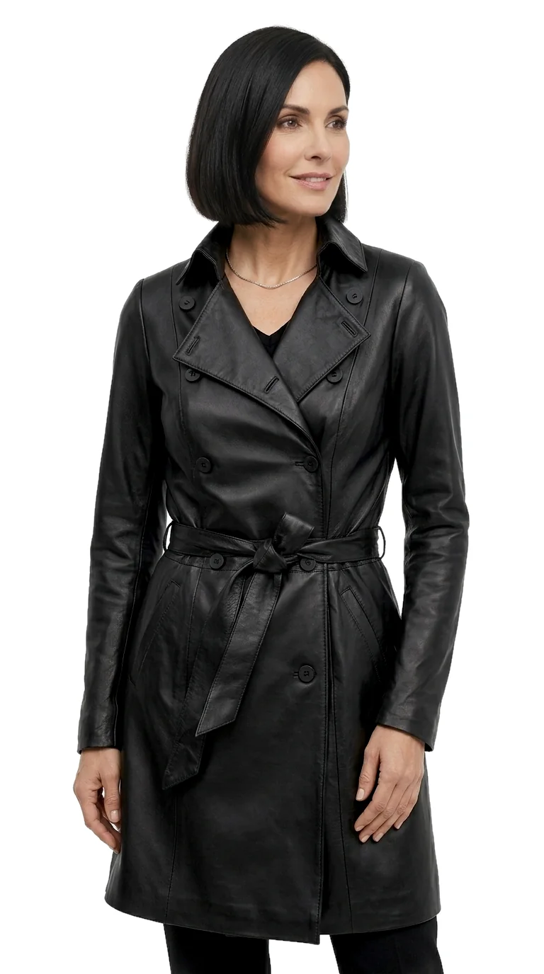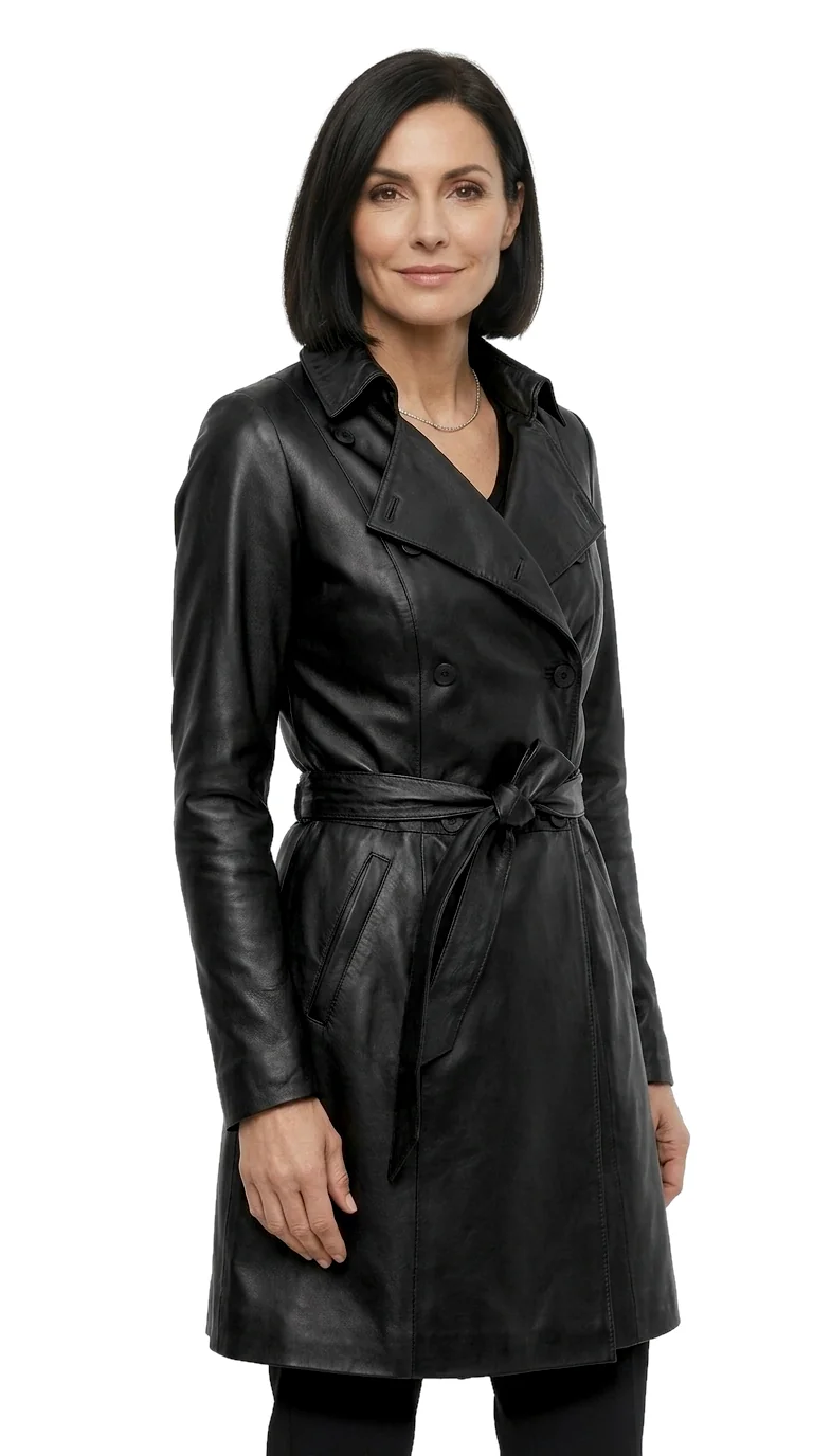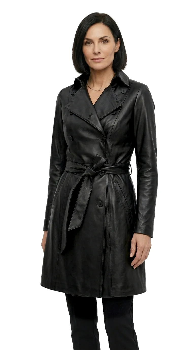 Dwurzędowy płaszcz skórzany damski wiązany paskiem DORJAN