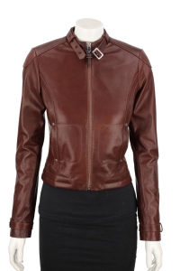 Model EWA122 firmy DORJAN to kurtka skórzana damska typu biker, uszyta z brązowej skóry owczej. Przylegająca, niska stójka wykończona paskiem z klamrą, pasy na tyle kurtki, czy przeszycia wokół kieszeni sprawiają, że kurtka ma żywiołowy, rockowy styl. Fason blisko ciała ładnie podkreśla damską sylwetkę. Niepowtarzalne dodatki w połączeniu z ciekawym projektem, dają w efekcie nowoczesną kurtkę w motocyklowej stylistyce, która świetnie sprawdza się wszędzie tam, gdzie nie jest wymagany formalny strój.