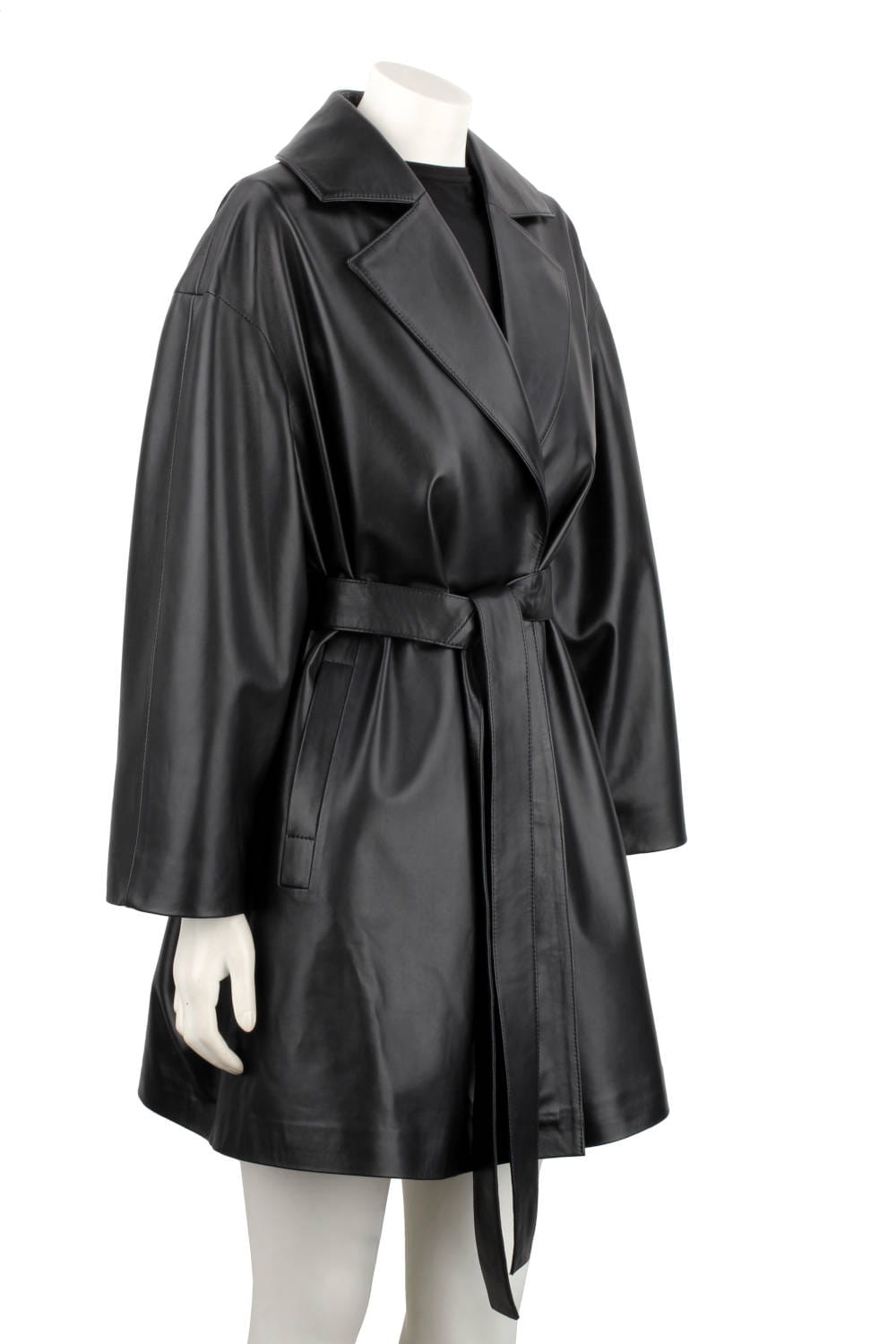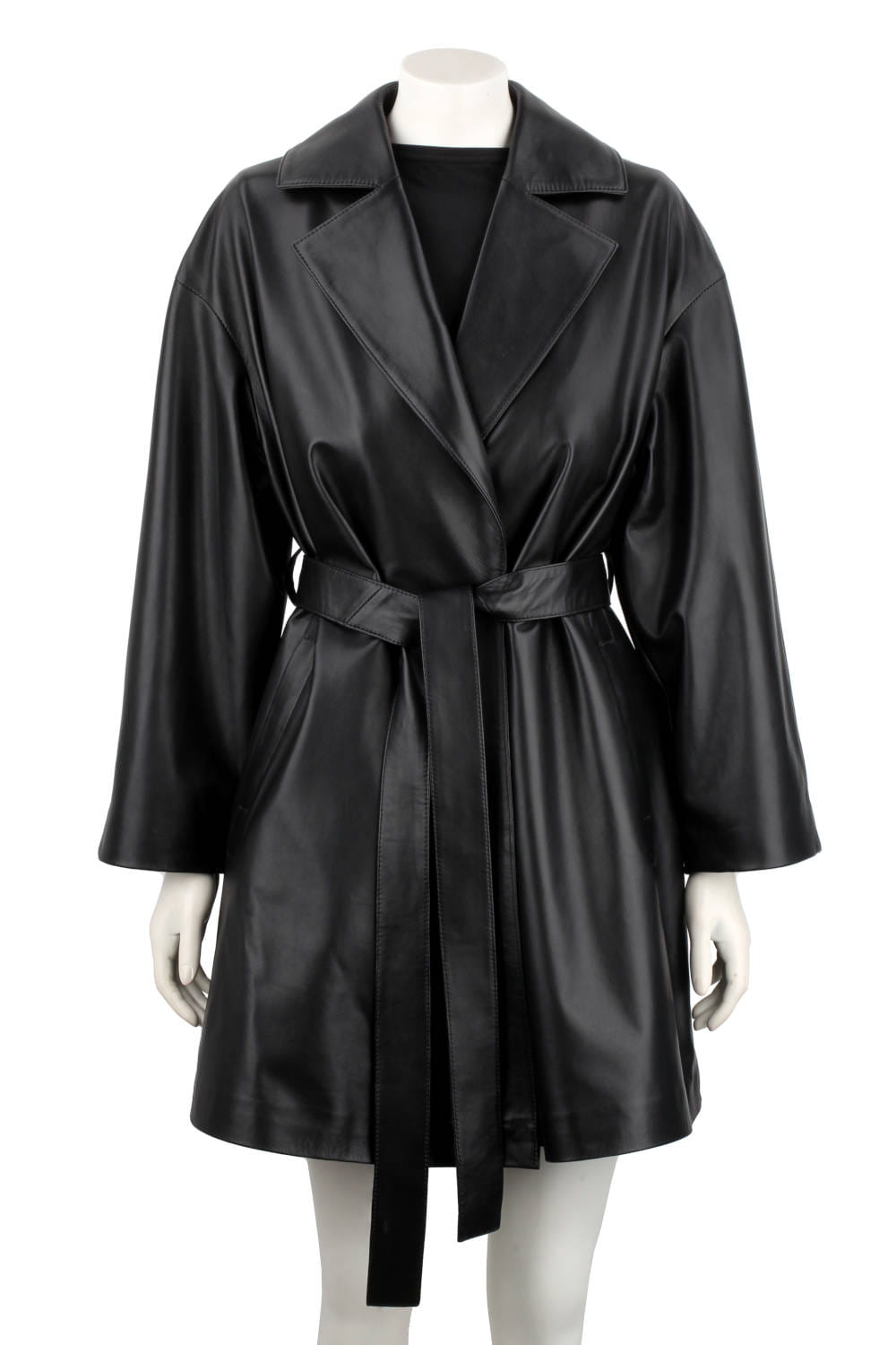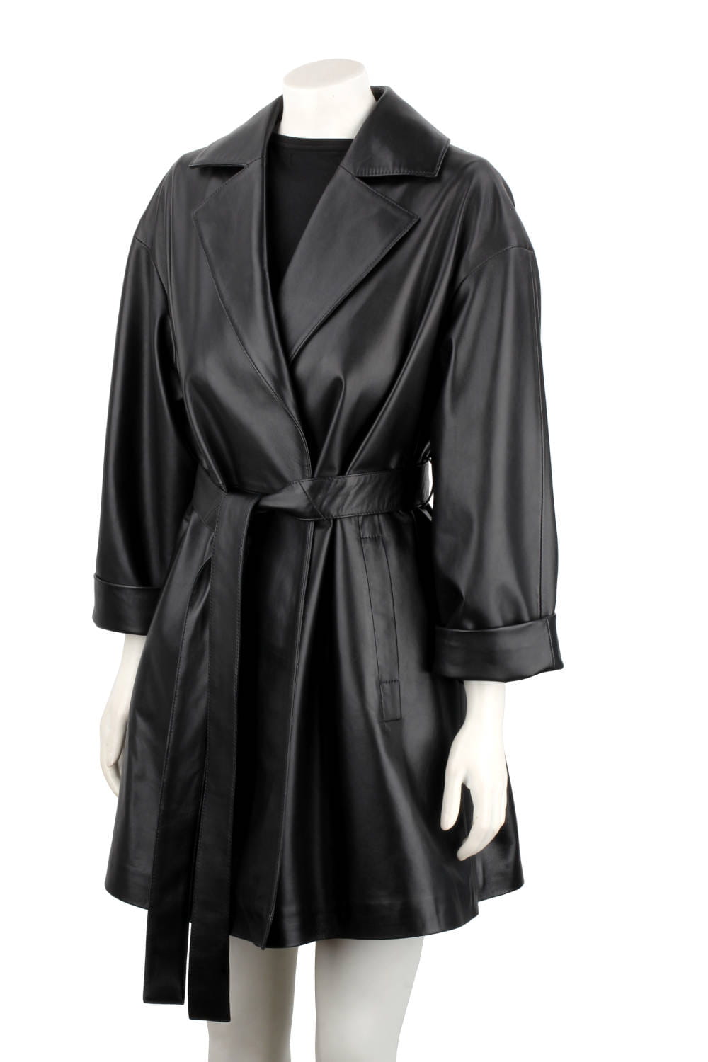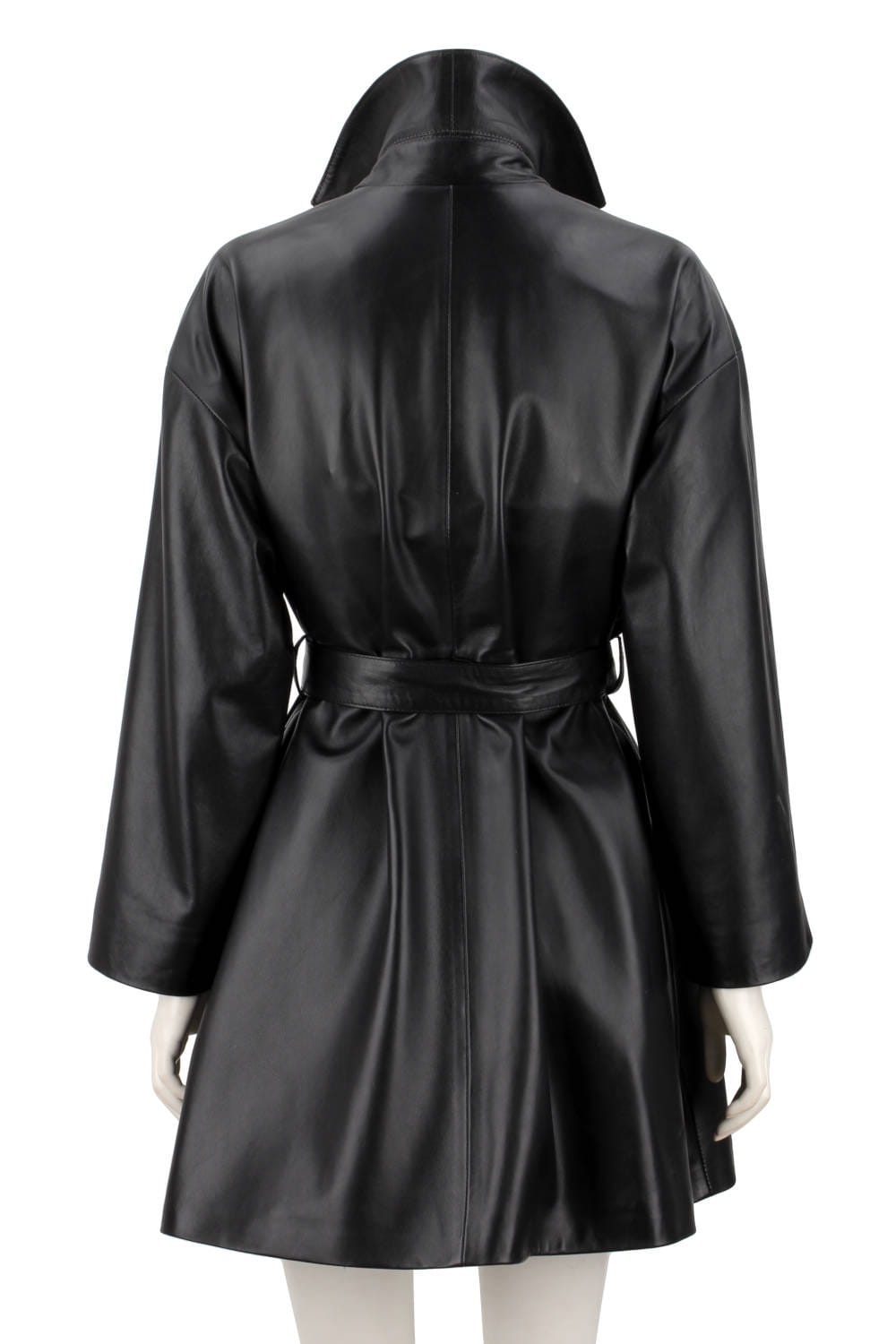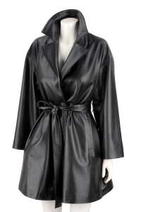Model FLO450 od firmy DORJAN to nowoczesny płaszcz skórzany damski w fasonie oversize. Płaszcz wykonany z najwyższej jakości czarnej skóry naturalnej licowej owczej. Minimalistyczna forma kroju z klasycznym kołnierzem posiadającym opcję postawienia, świetnie sprawdzi się zarówno jako casualowe uzupełnienie miejskiej stylizacji, ale może z powodzeniem posłużyć jako element bardziej eleganckiego stroju na oficjalne wyjścia. Brak zapięcia i wiązanie w tali powodują, że płaszcz bardzo łatwo dopasować do wymagań własnej sylwetki. Nie ograniczają nas sztywno ustawione guziki czy zamki. Szeroki rękaw ma opcję wywinięcia, co skraca długość i kreuje nowe opcje stylistyczne.