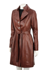 KRN122 - brązowy damski płaszcz skórzany wiązany w talii DORJAN