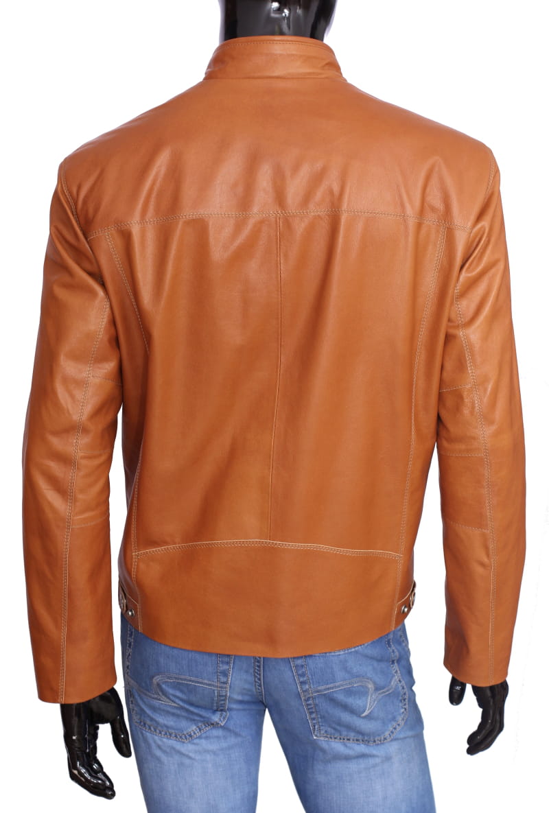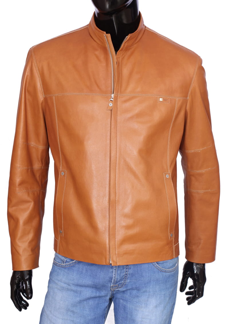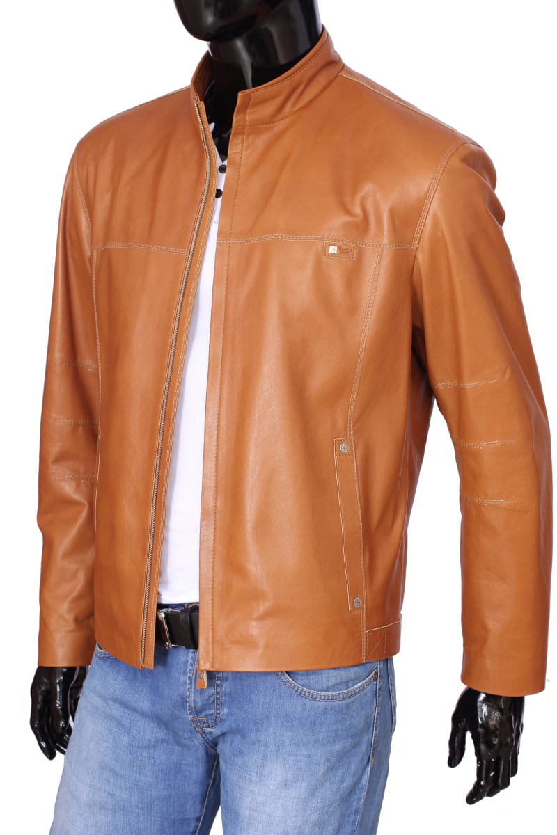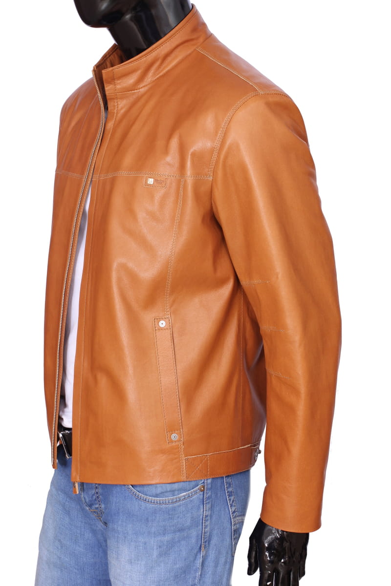 OLF080 - Skórzana kurtka męska w jasnym camelowym kolorze DORJAN