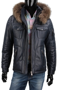 PTR074 - Niebieska zimowa kurtka skórzana męska z futerkiem DORJAN