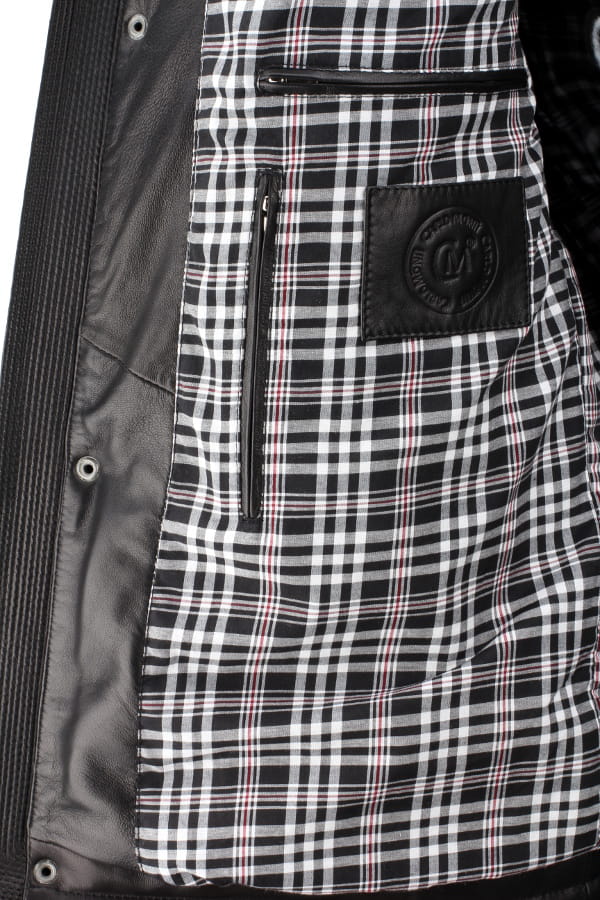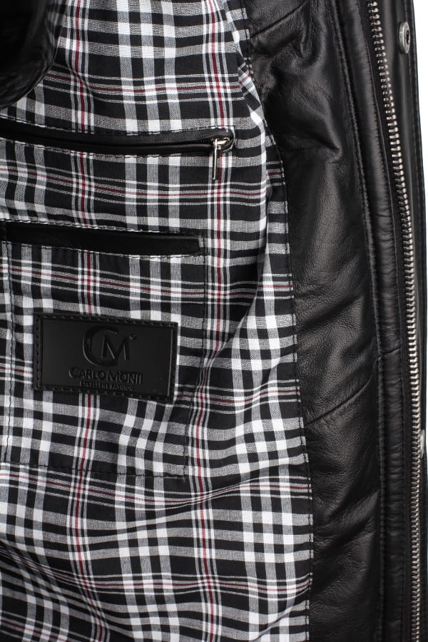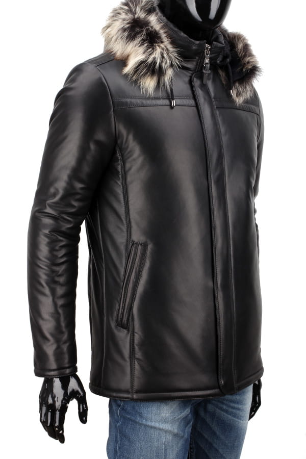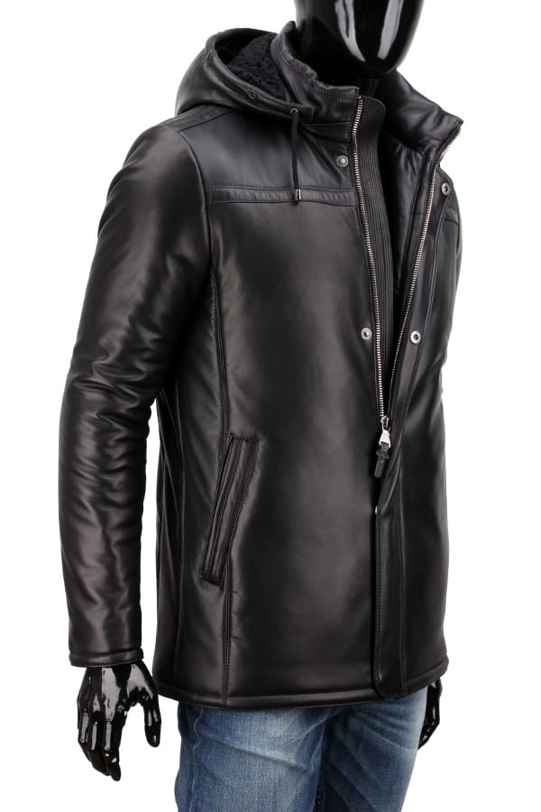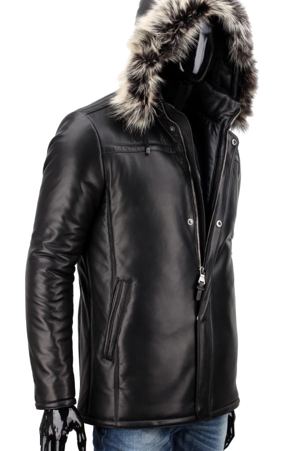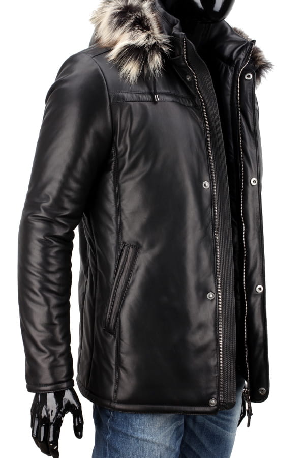 Model PTRL450 firmy DORJAN to lekka, wykonana z wysokogatunkowej skóry naturalnej, ciepła kurtka skórzana męska w klasycznym czarnym kolorze. PTRL to model wydłużony w stosunku do projektu standardowego. Dodatkowo zmieniono całkowicie stylistykę, rezygnując z zewnętrznych kieszeni na klatce piersiowej i upraszczając kieszenie dolne. Dzięki temu zabiegowi kurtka stała się bardziej elegancka i z powodzeniem może służyć jako okrycie wierzchnie na eleganckie okazje, czy na garnitur. Ocieplenie Thermo Fleece, zapewnia komfort termiczny zimową porą. Odpinany kaptur z wykończeniem z futra naturalnego z jenota (możliwość zmiany) zapewnia dodatkową osłonę przed zimnem i nadaje kurtce ekskluzywnego charakteru.