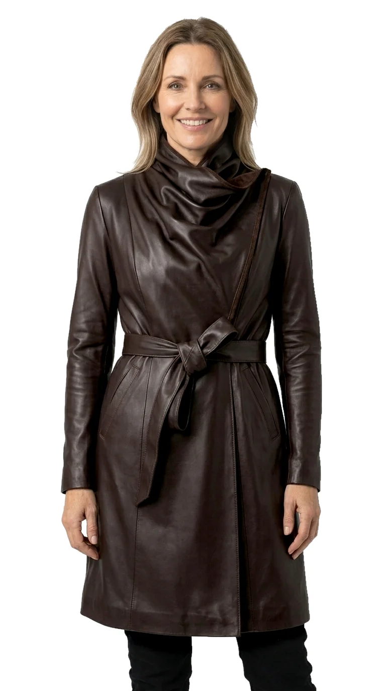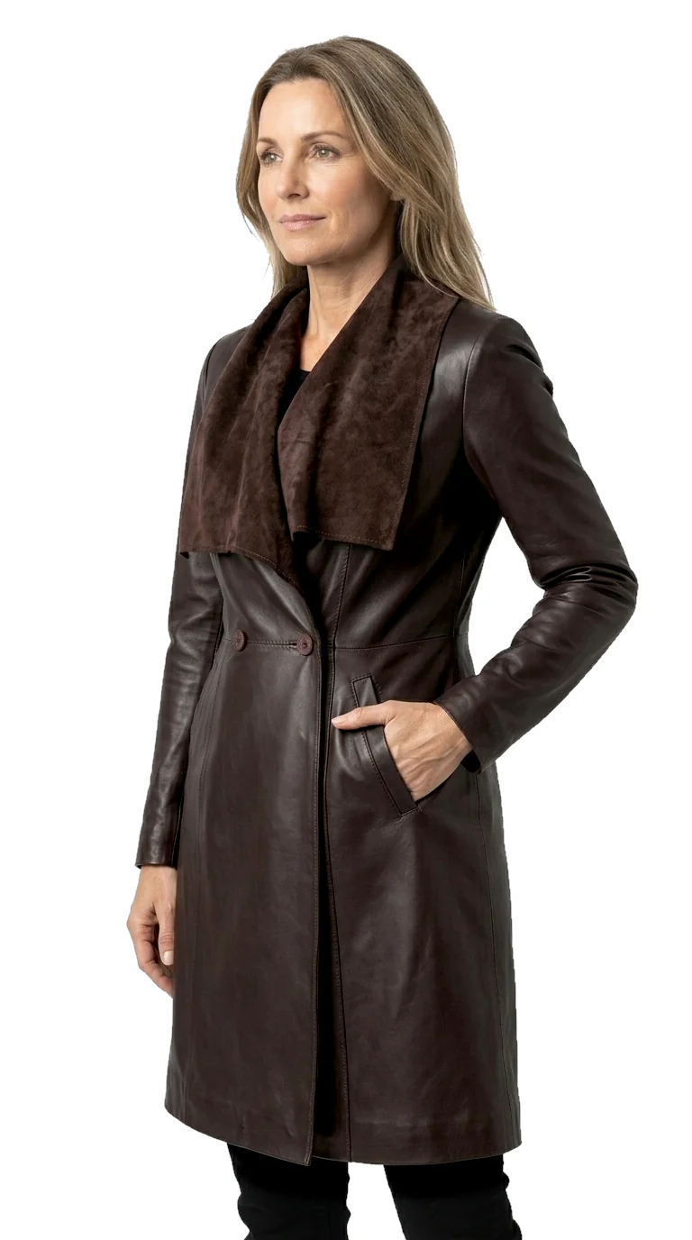 Płaszcz skórzany damski z szerokim szalowym kołnierzem DORJAN