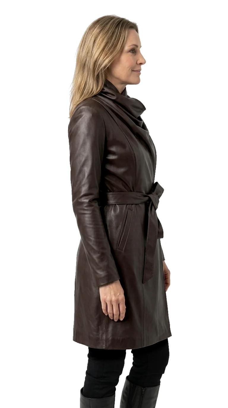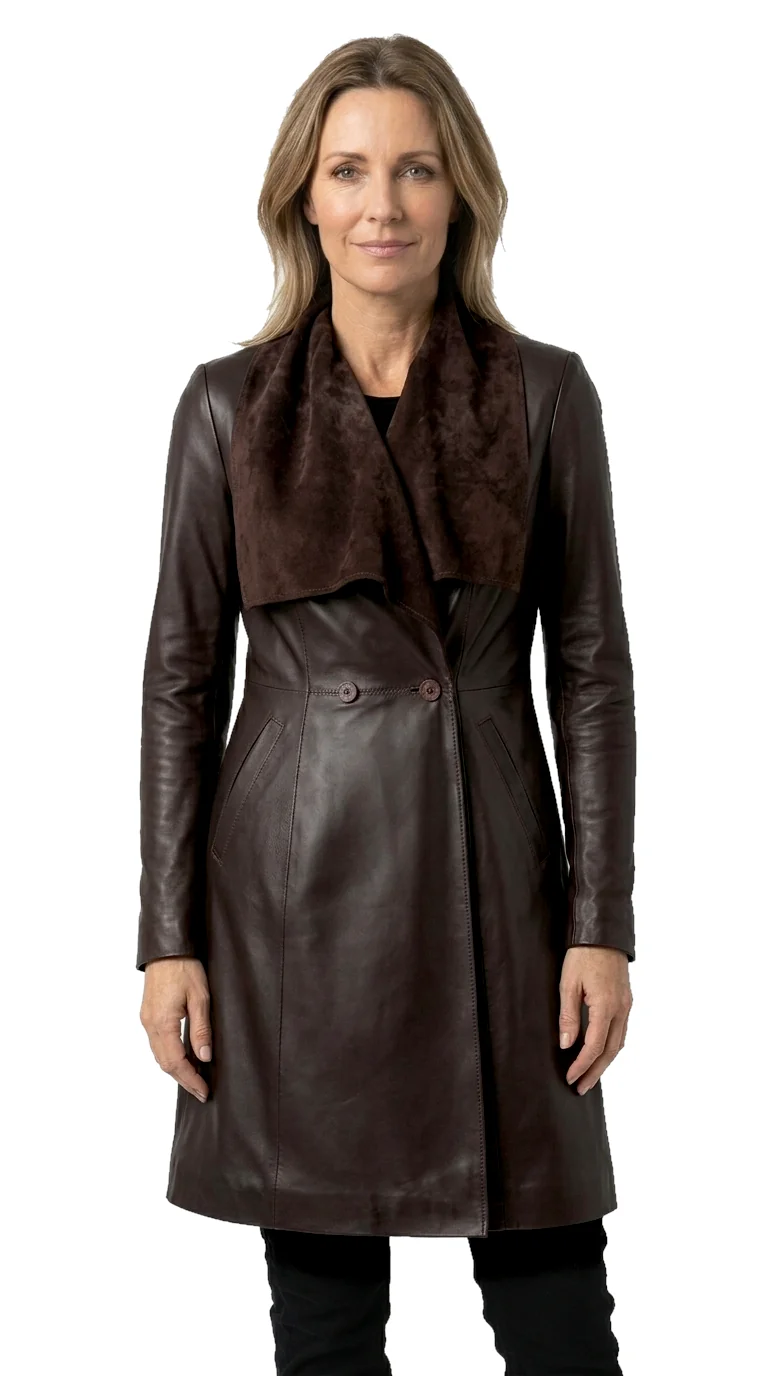 Model EST123ML firmy DORJAN to elegancki damski płaszcz skórzany, który łączy nowoczesne wzornictwo z klasyczną formą i codzienną funkcjonalnością. Charakterystycznym elementem płaszcza jest szeroki, szalowy kołnierz z możliwością przypięcia na nap, który pozwala na różnorodne sposoby stylizacji. Ciekawy efekt wizualny uzyskano dzięki połączeniu dwóch faktur skóry — licowej na zewnątrz i mizdry od spodu.
