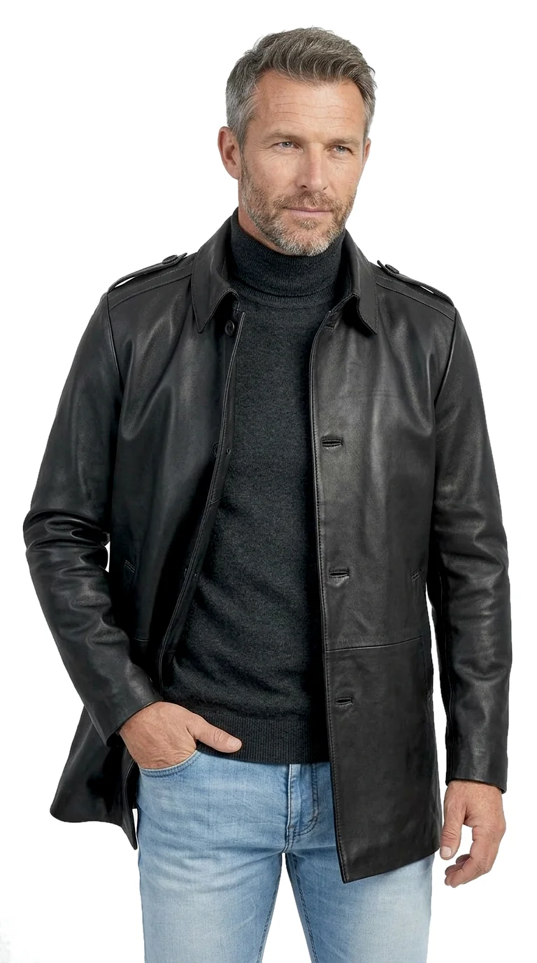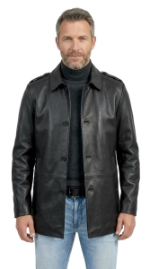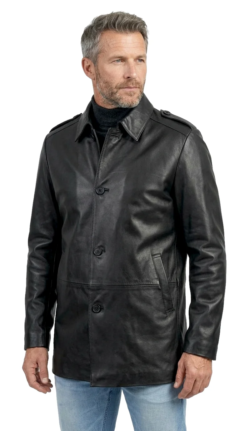 Model BIL450ML marki DORJAN to lekki, jednorzędowy płaszcz skórzany dla mężczyzn, zapinany na guziki. Wykonany z najwyższej jakości naturalnej skóry owczej w klasycznej czerni, łączy prosty, uniwersalny krój z eleganckim charakterem. Wysoki kołnierz z możliwością postawienia oraz pagony na ramionach nadają mu stylowy wygląd.
