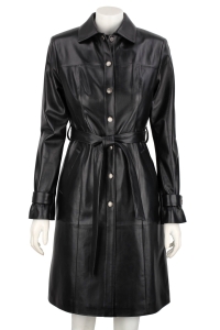Model ROMA450 firmy DORJAN to modny, nowoczesny płaszcz skórzany damski, uszyty z najwyższej próby czarnej skóry owczej. Jednorzędowe zapięcie na metalowe napy, ciekawe przeszycia, nowoczesny kołnierz, to tylko niektóre elementy tego damskiego płaszcza, które nadają mu nowoczesnego, casualowego stylu. Wiązanie skórzanym paskiem, pozwala dopasować płaszcz do sylwetki i podkreślić talię, co bardzo korzystnie wpływa na kształt figury i odbiór wizualny całości. Kołnierz ma opcję postawienia, dzięki czemu chroni przed wiatrem i daje ciekawe opcje stylizacji z wykorzystaniem dodatków np. szalu lub szalika.