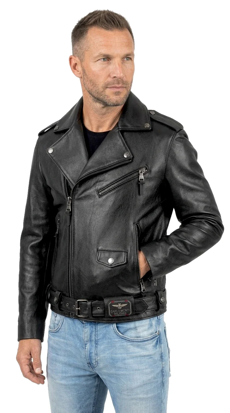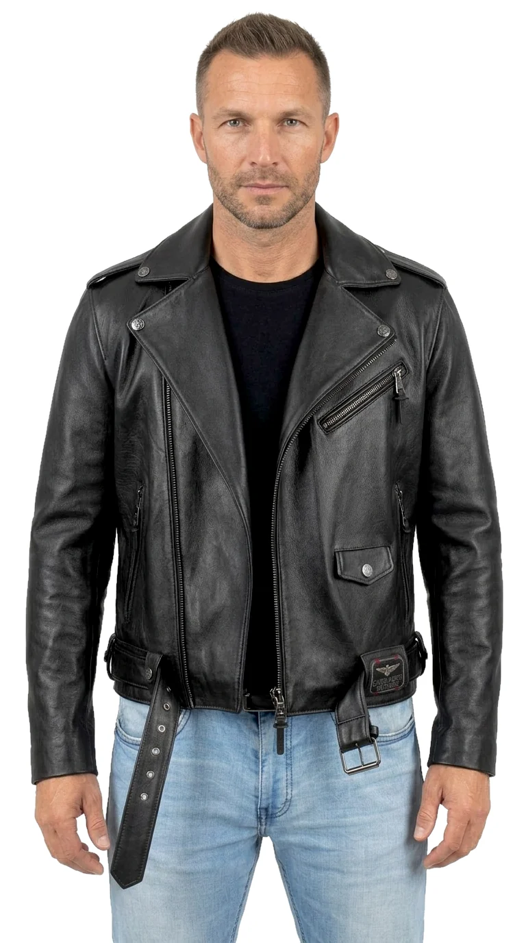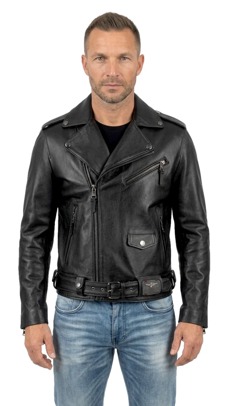 Wyróżniającym atutem jest zastosowanie grubszej skóry naturalnej, która nadaje kurtce solidności i charakteru. Choć model nie posiada typowych ochraniaczy motocyklowych, z powodzeniem sprawdzi się podczas rekreacyjnych przejażdżek jednośladem na krótkich dystansach. Detalem wartym uwagi jest naszywka z metalowym logotypem umieszczona na szerokiej szlufce paska, podkreślająca surowy, rockowy styl kurtki. To propozycja dla mężczyzn ceniących autentyczność, historię i wyrazisty styl.