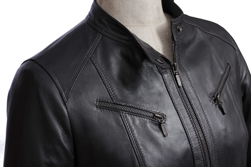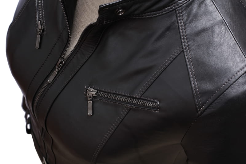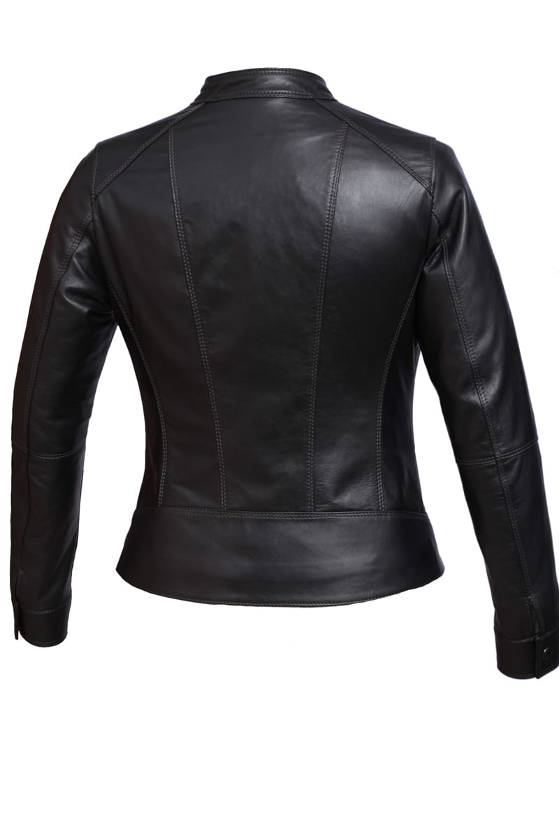 Model SAR450 firmy DORJAN to lekka, zapinana na zamek, uniwersalna kurtka skórzana damska w klasycznym czarnym kolorze. Wyraźne linie talii i bioder, oraz nietuzinkowe przeszycia z przodu i z tyłu kurtki, podkreślają kobiecą sylwetkę. Dodatki takie jak pasek zapinany na klamrę, oraz stójka zapinana na zatrzask nadają kurtce delikatnej, rockowej specyfiki. Polecamy dla kobiet ceniących sobie klasyczną elegancję, a jednocześnie chcących urozmaicić swój styl i nadać swoim kreacją wyrazistości i charakteru.