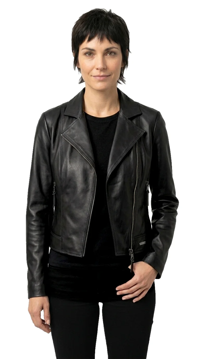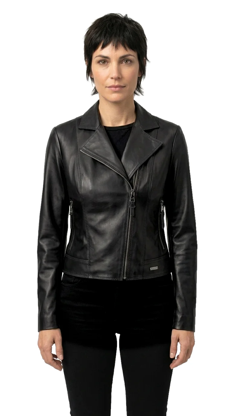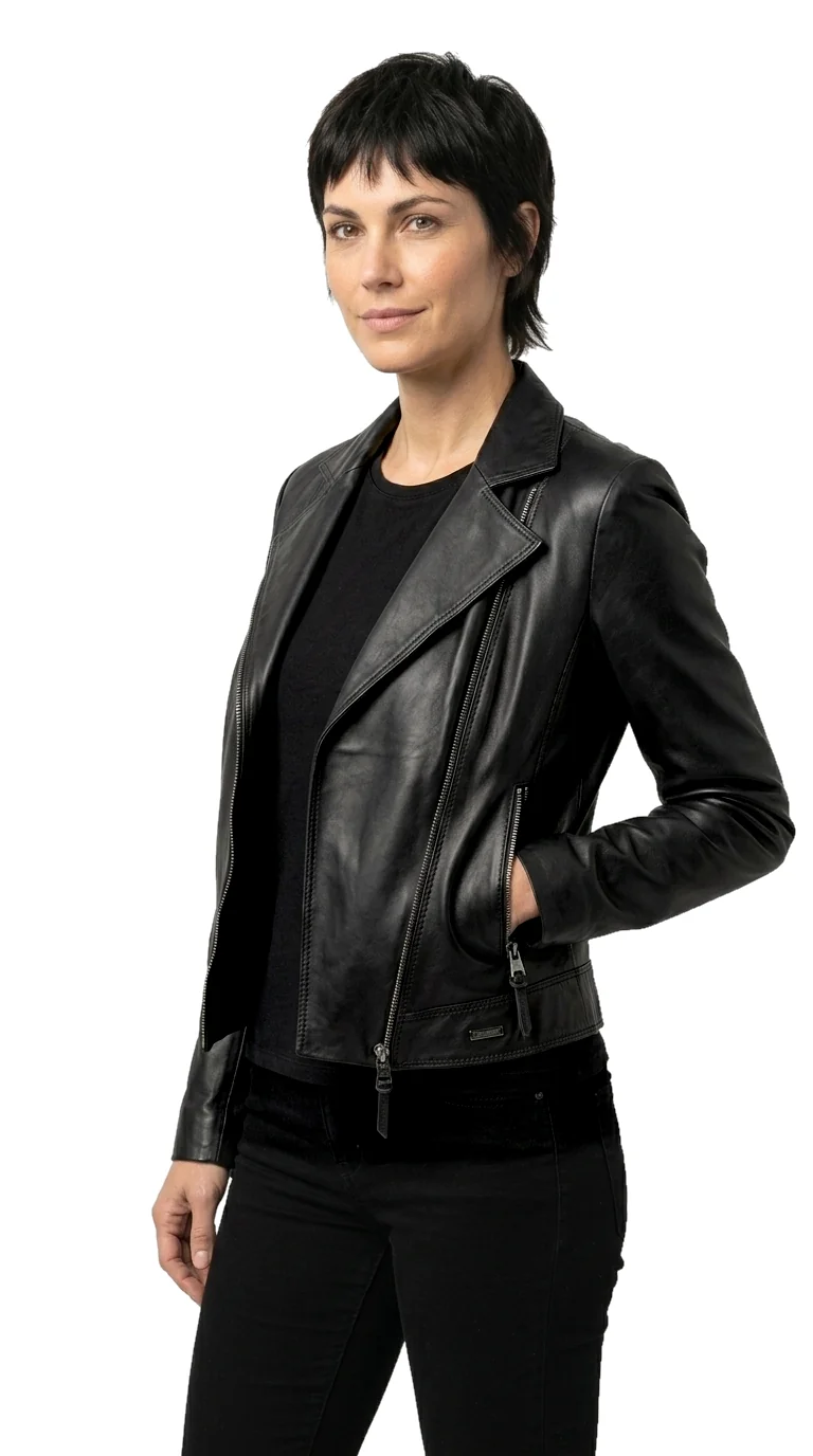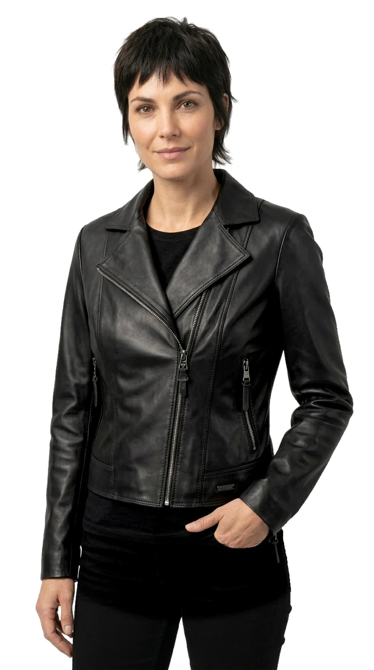 Ramoneska skórzana damska SFA450 firmy DORJAN to wyjątkowa kurtka skórzana damska, która zachwyca minimalistycznym designem i starannym wykonaniem. Projektanci postawili na prostotę formy, a jednocześnie na najwyższą jakość materiałów, jakie zostały użyte do produkcji tego modelu. Ramoneska została uszyta z czarnej skóry naturalnej, która cechuje się wyjątkową lekkością i przyjemnym chwytem. Dzięki temu nasza ramoneska jest lekka i bardzo dobrze układa się na sylwetce.