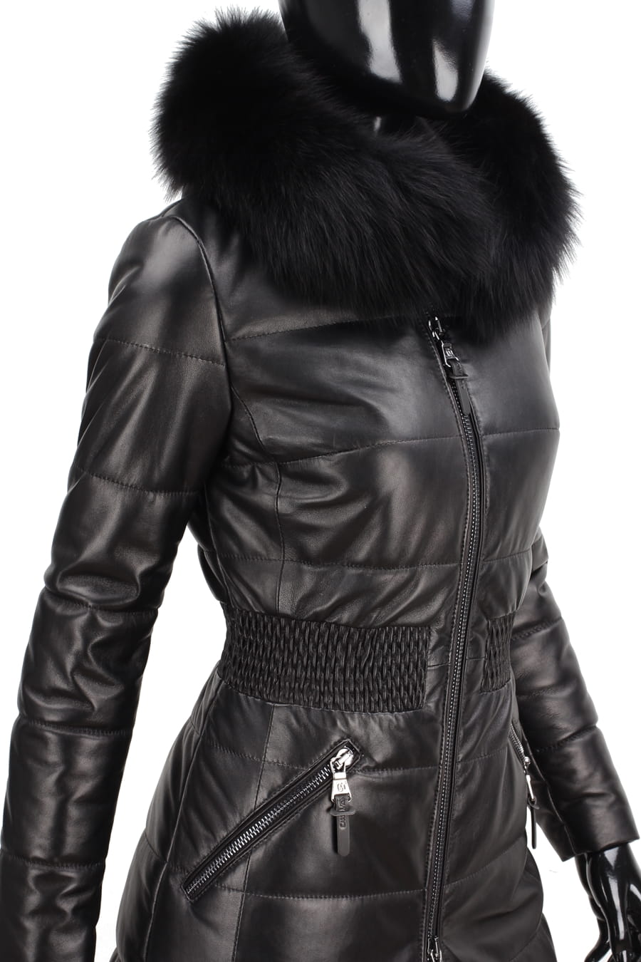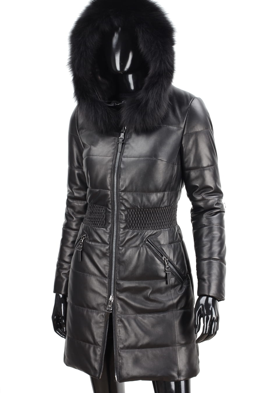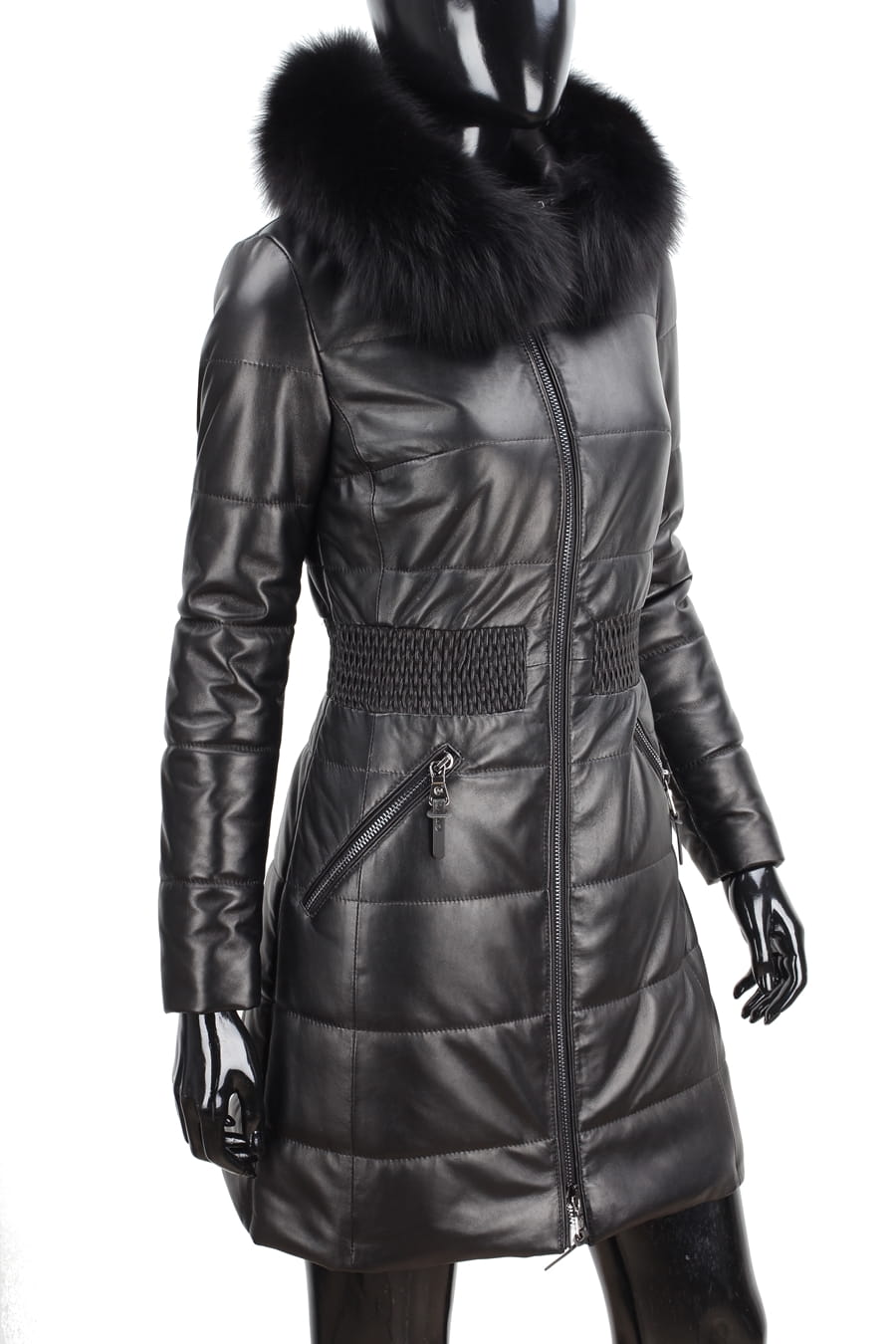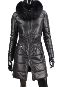 SYL450_1 - czarny pikowany płaszcz skórzany damski z futerkiem DORJAN